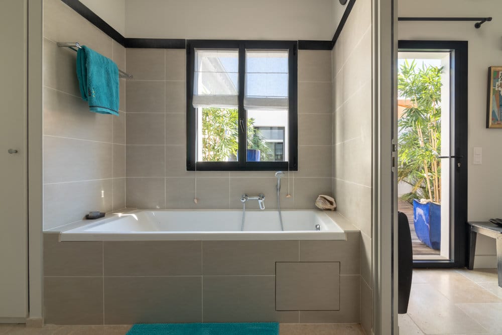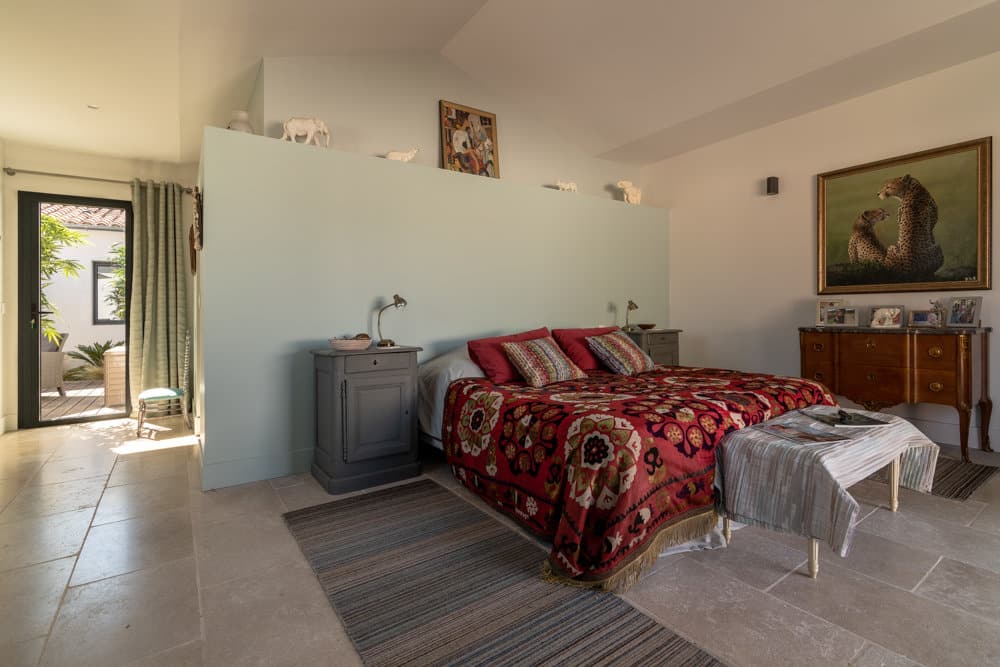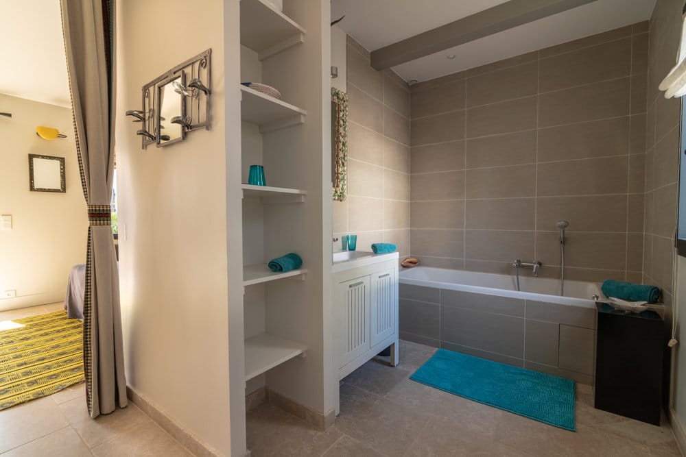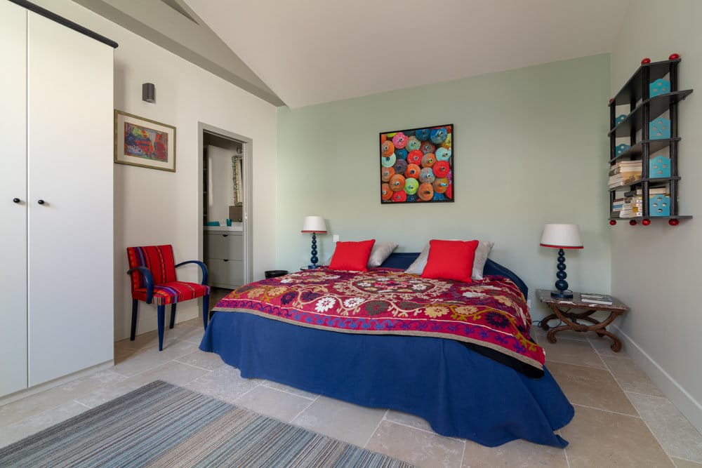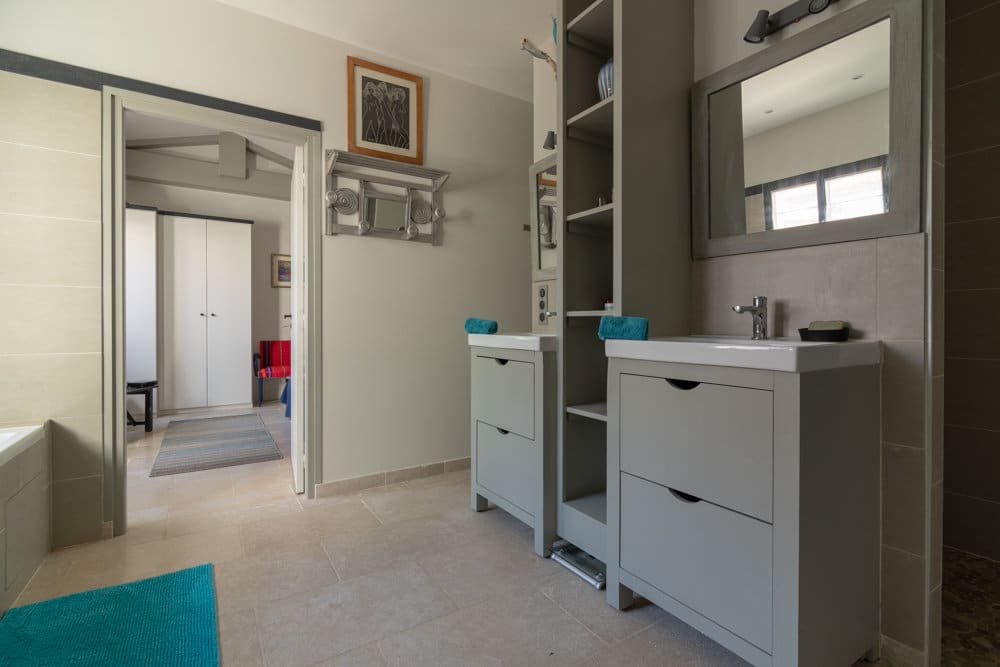 - Master suite with double bed (bed 180 x 200 cm) and en-suite bathroom: bath and walk-in shower and WC