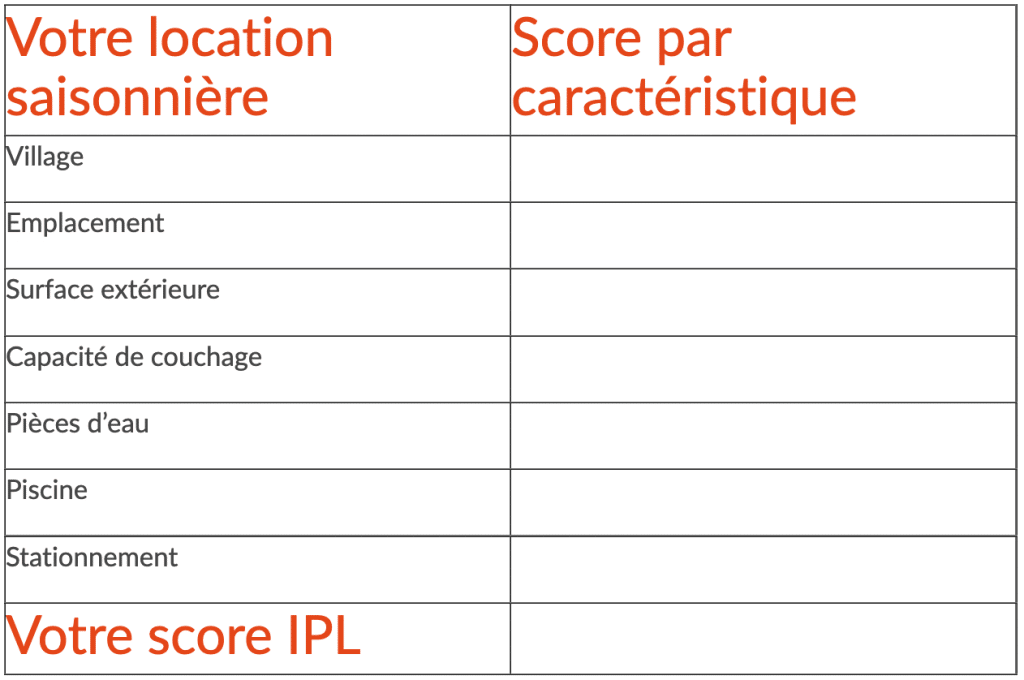 Après avoir analysé votre location saisonnière ou votre futur investissement, caractéristique par caractéristique, il est alors possible d’en estimer l’Indice de Potentiel Locatif (IPL) :
